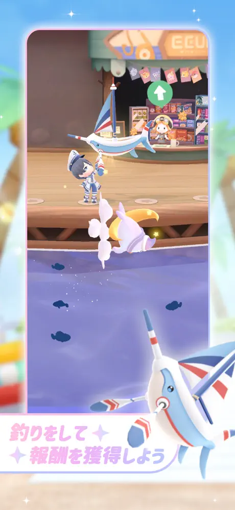 遊ぶ海の仲間を連れて、お出かけすることができますので、一緒に泳いで釣りをして、癒しの時間を過ごしましょう!